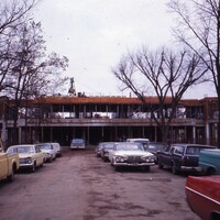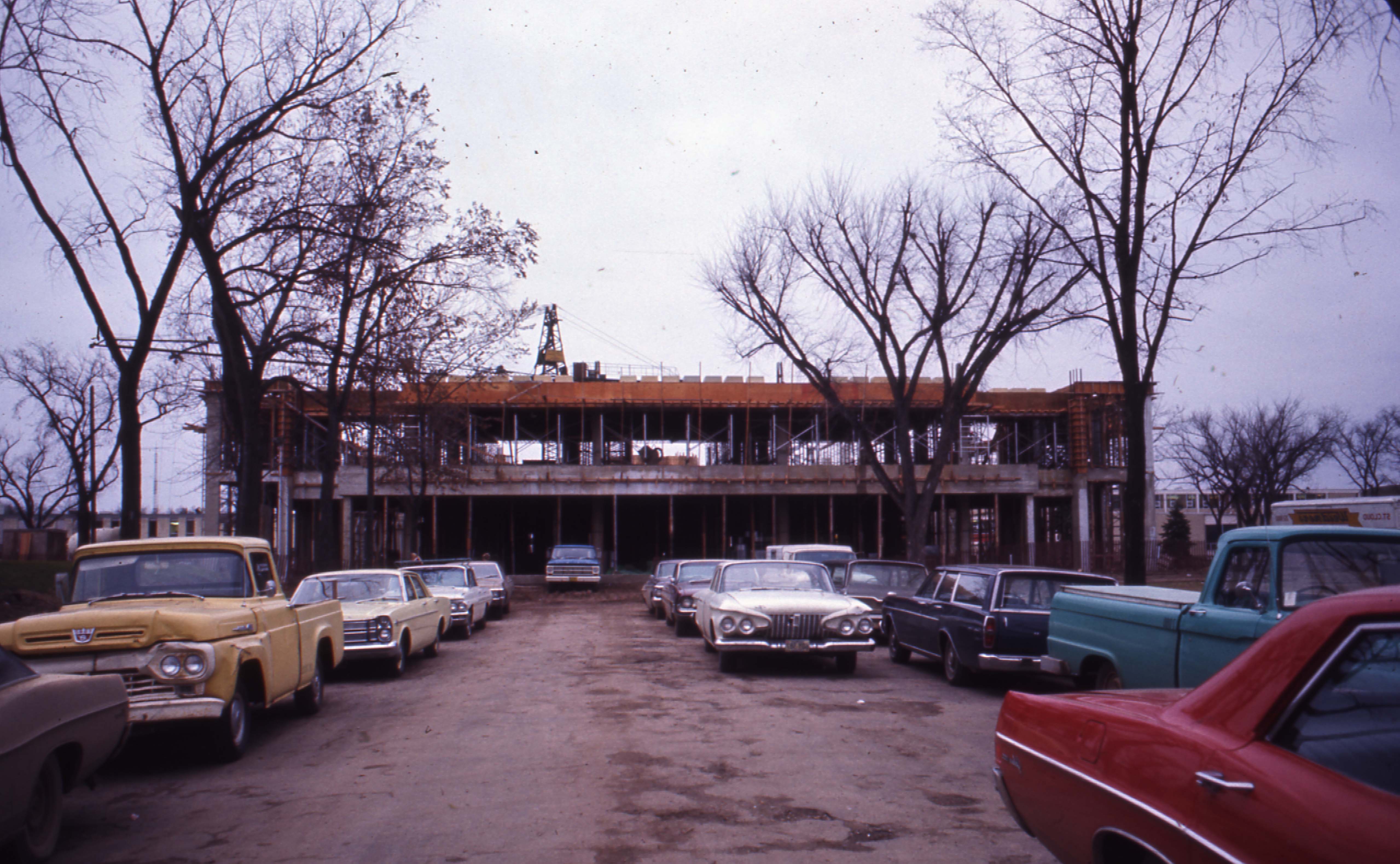 - A partially constructed two-story building is centered in the image, with exposed steel beams and an unfinished roof. Several bare trees surround the site, indicating late autumn or early winter. In the foreground, a dirt or gravel driveway leads to the building, lined with parked vehicles from the mid-20th century, including sedans and pickup trucks in various colors such as yellow, blue, and red. The sky is overcast, creating a muted, gray atmosphere.