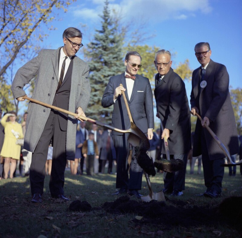 St. Cloud State kicked off its centennial celebration with Heritage Day on October 2, 1968. The main event was groundbreaking for the new library building. Centennial Hall, described as the "new campus focal point" and the “official Centennial year building,” was to be built on the intersection of 7th Street South and 3rd Avenue South. Participating in the groundbreaking were Minnesota state college chancellor Theodore Mitau, Minnesota governor Harold LeVander, St. Cloud State president Robert Wick, and City of St. Cloud mayor Edward Henry.