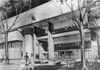 Rectangular in shape, each floor was cantilevered to provide shade for the floor below. Sculptural in design, the building was influenced by Swiss architect Le Corbusier’s 1955 High Court building in Punjab, India. Centennial Hall is constructed of reenforced concrete with red brick that softens the gray, concrete walls. The 2007 renovation ruined the building’s sculptural aspect when windows were punched into the walls of the top story.